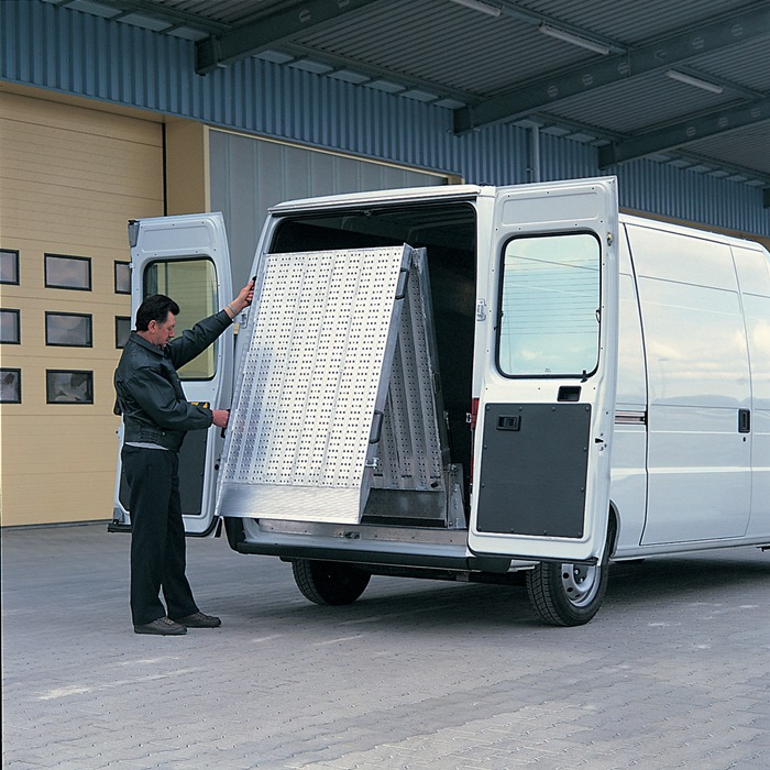 Die KFZ Einbaurampen wurden speziell für den Einbau in gängige Transporter-Modelle entwickelt. Die Einbaurampe vereinfacht die Abläufe beim häufigen Be- und Entladen. Sie eignet sich ideal in gewerblichen Betrieben, im Handwerk und Bäckereibetrieben oder auch in Reinigungsfirmen und Kurier- und Auslieferungsbetrieben. Mit Hilfe einer integrierten Gasdruckfeder können Sie die Rampe einfach, schnell und komfortabel bedienen. Die speziell gelochte Fahrfläche ermöglicht eine rutschfeste Lauffläche und sicheren Einsatz bei den einzelnen Verladevorgängen. Während der Fahrt steht die Rampe in senkrechter Position und wird durch entsprechende Verschlusssicherungen gehalten. Integrierte Gummipuffer und Spezialschlösser verhindern Klappergeräusche während der Fahrt.