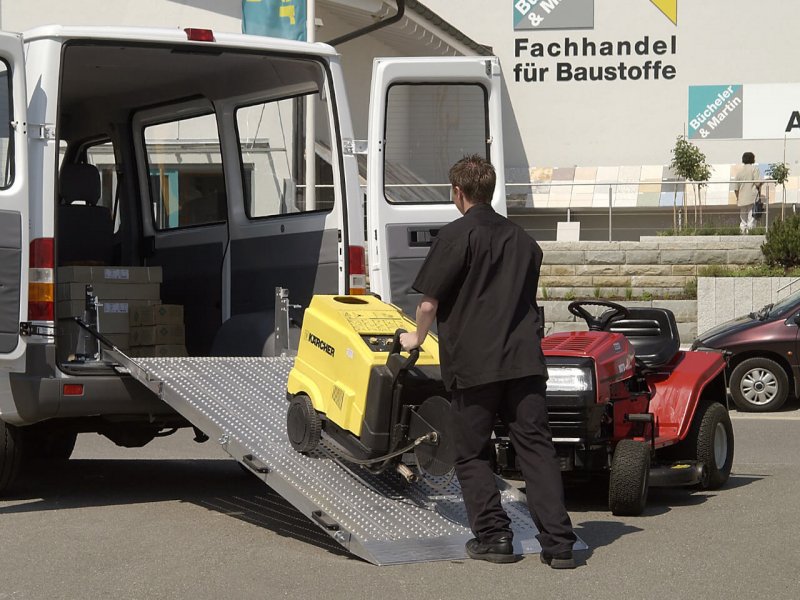 KFZ Einbaurampen für Transporter sind geeignet zur Verladung bis 450 kg von Paketwagen, Etagenwagen, Wäschecontainern, Rollcontainern, aber auch von kleineren Fahrzeugen wie Minibagger, Baumaschinen, kleine Radlader oder größere Rasentraktoren, die mit Luftbereifung oder Gummiketten ausgerüstet sind.