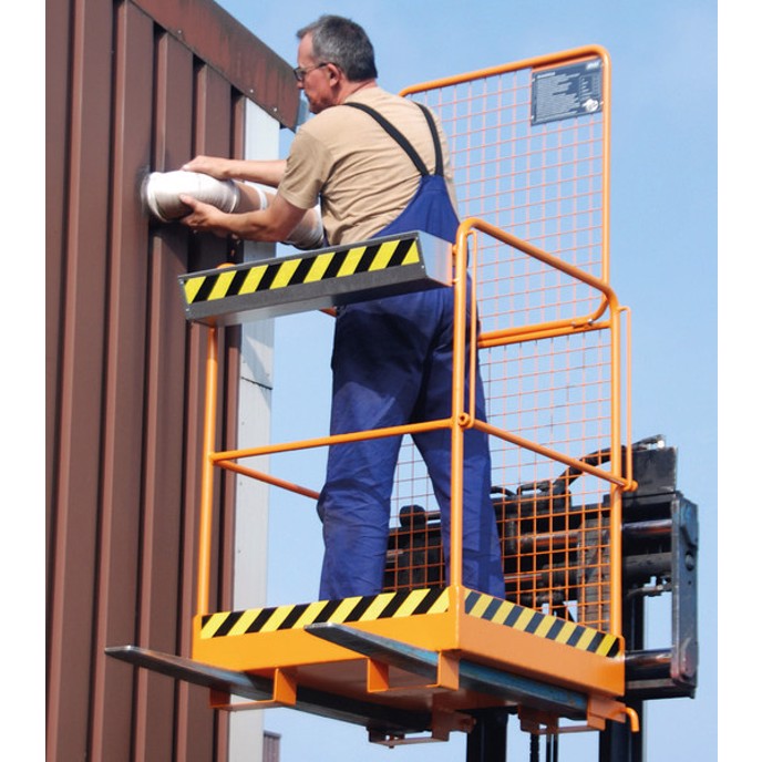 Arbeitsbühne / Arbeitskorb für sicheren Einsatz bei Reparaturen und Wartungsarbeiten an hochgelegenen Stellen Aufnahme mit Gabelstapler, an der breiten Seite. Inklusive Werkzeugablage und PSA Anschlagpunkt Produktinformation: Der Arbeitskorb, Arbeitsbühne, Personenkorb oder auch Hubarbeitsbühne genannt, bietet Sicherheit bei der Reparatur- und Wartungsarbeiten an hochgelegenen Gebäudeteilen, Maschinenanlagen, Deckenbeleuchtungen, Inventuraufnahmen etc. entsprechend den Unfallverhütungsvorschriften (UVV). Durch seine robuste Stahlkonstruktion und rutschsichere Arbeitsplatte bietet der Arbeitskorb sicheres Arbeiten in den verschiedensten Höhen Der Arbeitskorb / Arbeitsbühne ist Serienmäßig mit einer Werkzeugablage ausgestattet und gefertigt nach BGVD 27 (Flurförderzeuge). 300 kg Tragkraft / zulässiges Gesamtgewicht Zulässig für 2 Personen Farbe: RAL 2004 Orange Stabile Vierkantrohrkonstruktion Queraufnahme Einstieg nach innen zu öffnen (schmale Seite) Rutschsichere Arbeitsplattform Einfahrtaschen für Gabelstapler Klappbares Schutzgitter Inklusive Werkzeugablage TÜV geprüft Lackierung orangegelb RAL 2004, andere Farben auf Anfrage möglich Eigengewicht: 125 kg Maße BxTxH: 1200 x 800 x 1910 mm Standfläche: 800 x 1200 mm Vorteile: geeignet für die Aufnahme mit Gabelstapler und Schubmaststapler massive Stahlkonstruktion (Vierkantrohr) - für den häufigen Gebrauch Aufnahmemöglichkeit (breite Seite) TÜV geprüft, gemäß UVV Serienmäßig mit Werkzeugablage Pulverbeschichtet Robuste Stahlkonstruktion zulässig für 1 - 2 Personen (Gesamt 300kg) mit Einfahrttaschen für die Aufnahme durch Gabelzinken mit Eingangstür (nach innen öffnend) Einfahrtaschen-Maße RAK Breite Seite A B C Maße in mm 620 180 90 Bemerkung: Die Tragfähigkeit des Gabelstaplers muss bei höchster Hubhöhe mindestens das 5-fache des Gewichtes betragen, das sich aus dem Eigengewicht der Arbeitsbühne, dem Gewicht der mitfahrenden Personen und der Zuladung ergibt.
