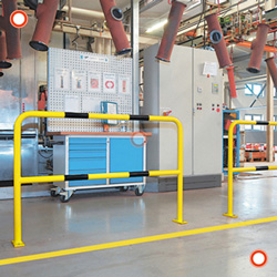 Schutzbügel gelb/schwarz zum Aufdübeln aus Stahl zur einfachen Trennung und Sicherung von Lagerflächen und Maschinen im Innenbereich. Gebogenes Stahlrohr mit zusätzlichem Knieholm. Vielfältig einsetzbar: Einfache und preiswerte Absicherung von Personenverkehr (Eingänge, Türen, Einfahrten), Produkt- und Maschinenschutz im Lager, Abtrennung von gefahrgeeigneten Arbeitsbereichen. Gebogenes Stahlrohr mit zusätzlicher Knieleiste. Gelb beschichtet, 6 schwarze Signalstreifen. Zum Aufdübeln, mit massiven Bodenplatten (150x150x6 mm) Bohrloch Ø 14 mm Rohrstärke Ø 40 mm / Wandstärke 1,5 mm Maße H x B mm: 1000 x 2000